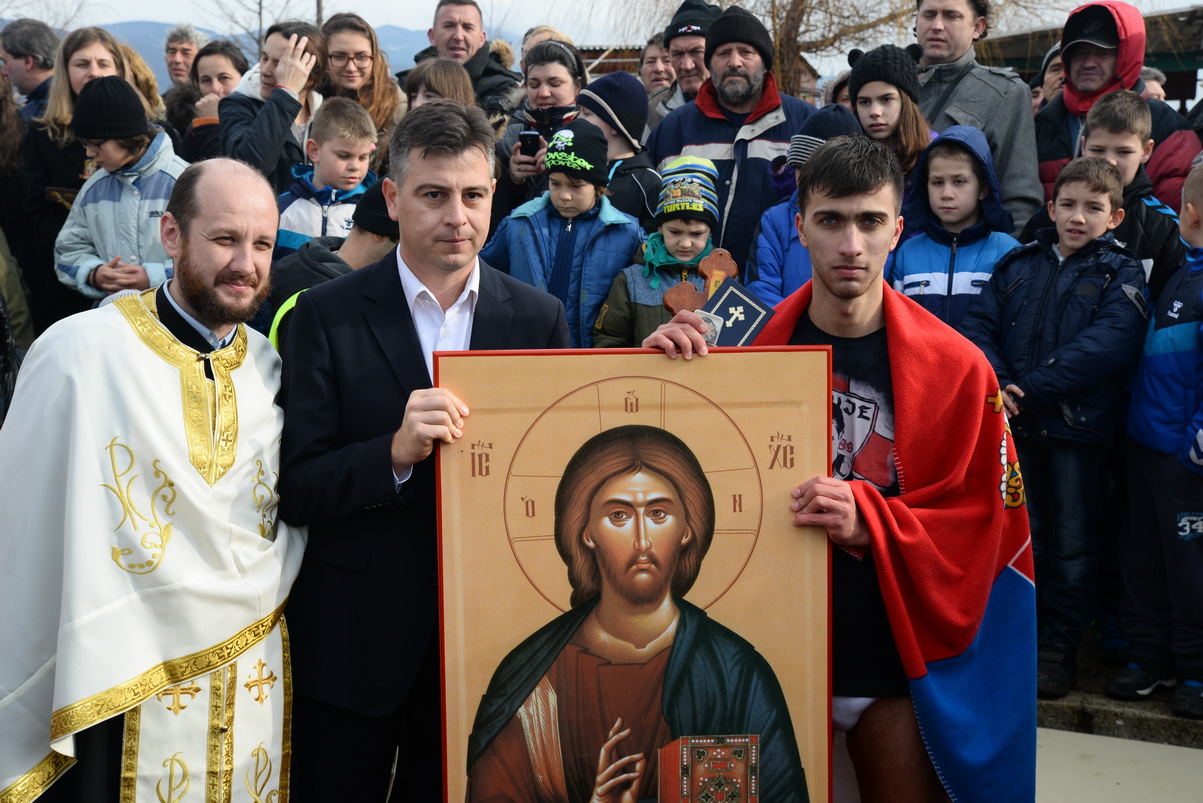 Васић је победнику овогодишњег пливања Милошу Вучићу уручио и вредан поклон-икону.