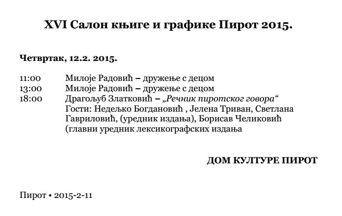 Sutra će, u okviru Salona knjige i grafike biti održana promocija Rečnika pirotskog govora, autora Dragoljuba Zlatkovića. Reč je o veoma značajnom delu na kome je autor radio decenijama.