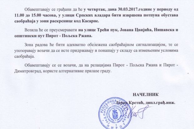 Načelnik odeljenja za urbanizam i stambeno komunalne poslove Zoran Krstić poslao je saopštenje sledeće sadržine: