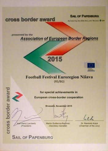 Moto ovogodišnje nagrade bio je: “Budućnost prekogranične saradnje u Evropi”. Prestižnu nagradu AEBR-a za 2015. godinu Euroregion Nišava dobio je za projekat: FESTIVAL FUDBALA EUREGIO NIŠAVA 2015. koji je održan pod sloganom IGRAJMO FUDBAL ZAJEDNO.
