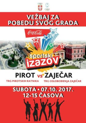 U subotu u hali “Kej” održaće se velika sportska manifestacija Sportski izazov u kojoj će se, istovremeno, dva grada – Zaječar i Pirot, takmičiti u sportskim aktivnostima i vežbi. Cilj manifestacije koju organizuju Olimpijski komitet Srbije i Coca-Cola, uz veliku podršku grada Pirota, Sportskog centra Pirot i pirotskih sportista je promocija sporta i zdravih stilova života. Manifestacija počinje u subotu u podne, a zbog najavljenog lošeg vremena, umesto na centralnom gradskom trgu, događaj će se organizovati u hali “Kej” pa organizatori apeluju da što veći broj Piroćanaca, ne samo sportista već i rekreativaca, roditelja i rodbine malih sportista, dođe u halu “Kej” s obzirom da će pobediti onaj grad u kome se veći broj učesnika uključi u sportske aktivnosti najmanje 15 minuta.
