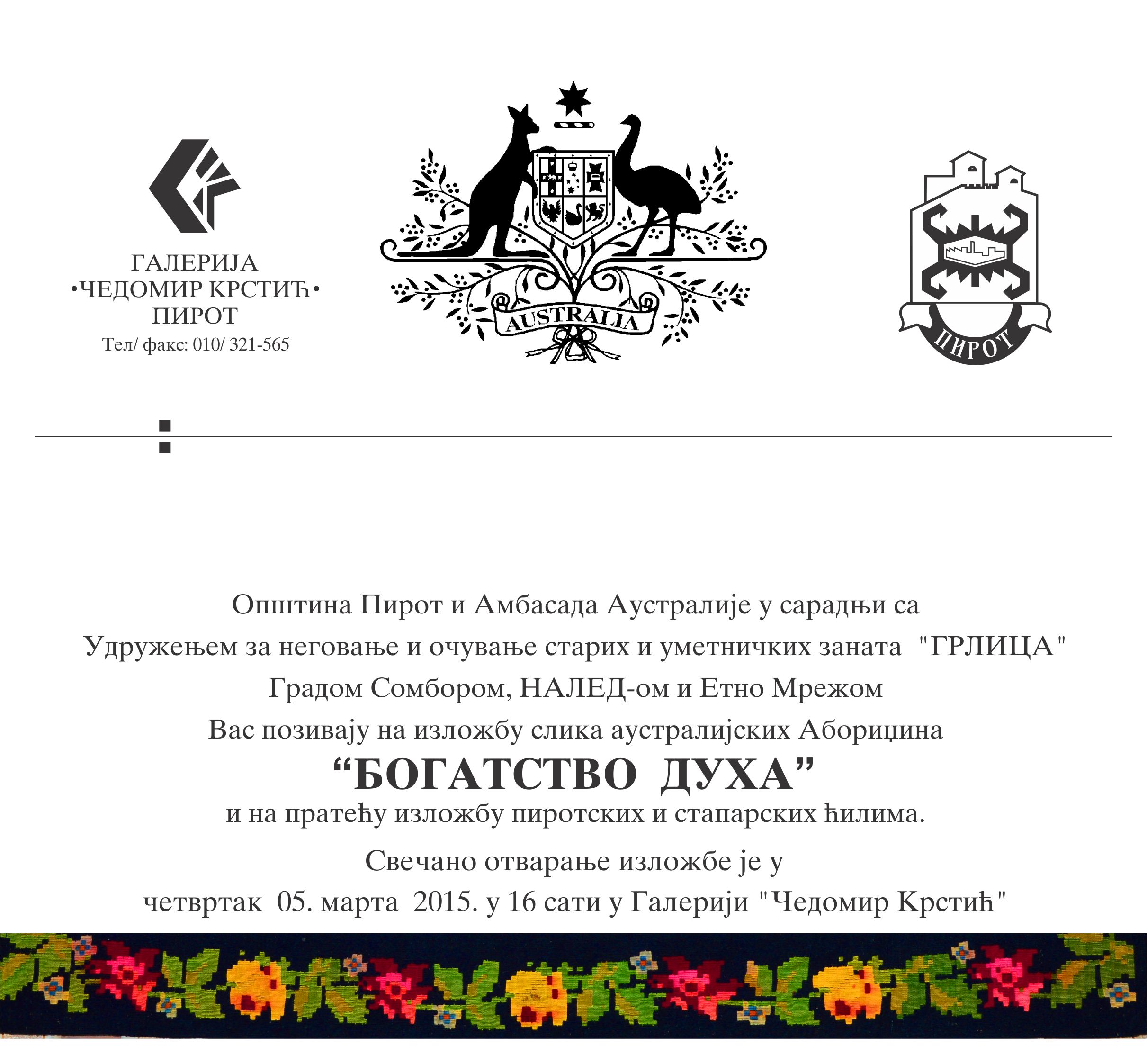 U Galeriji “Čedomir Krstić” će 5. marta sa početkom u 16h biti svečano otvorena izložba slika australijskih Aboridžina pod nazivom “Bogatstvo duha”, kao i prateća izložba pirotskih i staparskih ćilima.